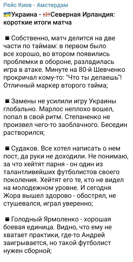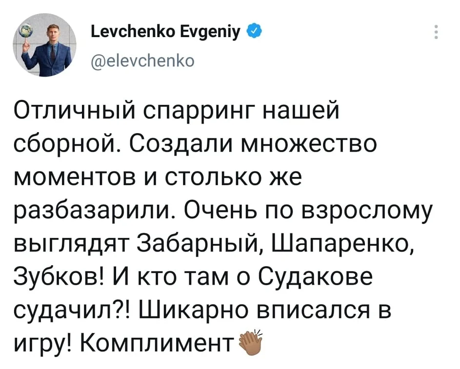 Экс-хавбек сборной Украины Евгений Левченко также доволен игрой подопечных Шевы. Самый большой комплимент достался юному Судакову.