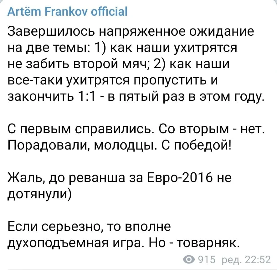 Главный редактор журнала "Футбол" Артем Франков так и не дождался реванша за Евро-2016.