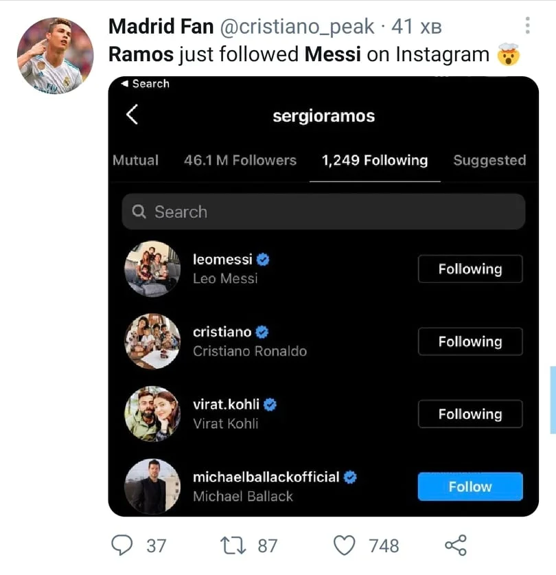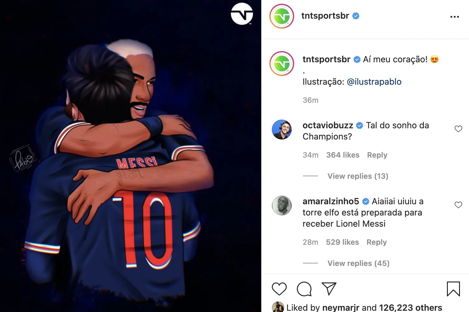 Экс-капитан Реала подписался на Месси в Instagram сразу после официального объявления об уходе из Барселоны. Не отстает и Неймар. Бразилец лайкнул публикацию TNT Sports Brasil, которое уже успело "переодеть" Месси в форму ПСЖ. На картинке Лео обнимается с Неймаром.