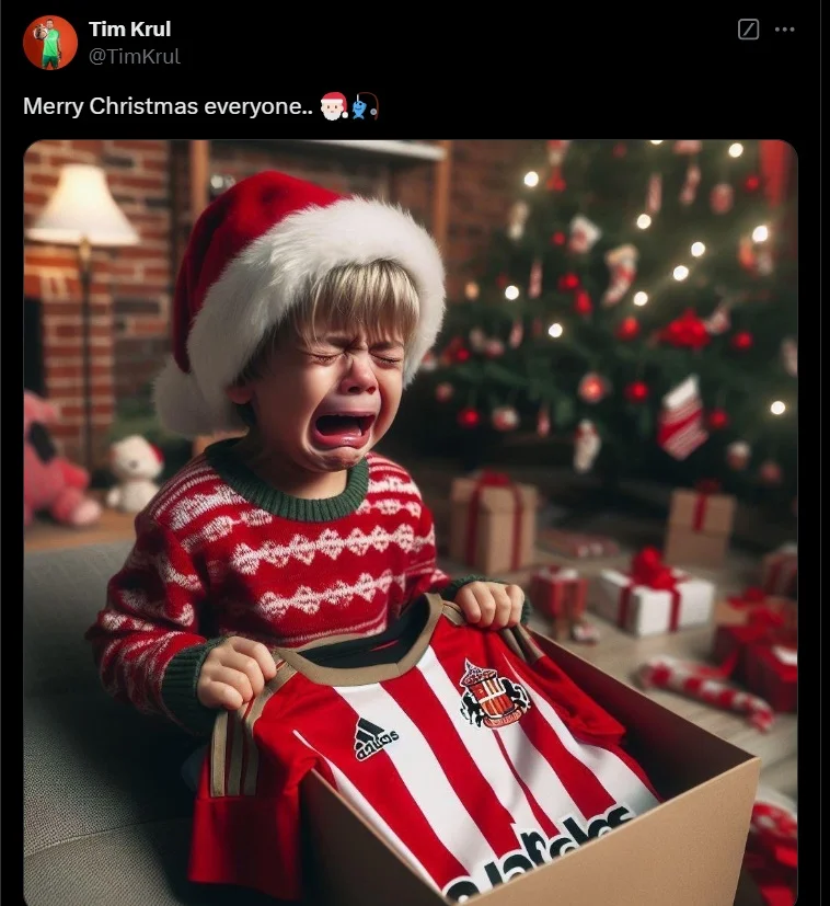 Нидерландец более десяти лет жизни и карьеры отдал Ньюкаслу. Хотя Крул окончательно покинул этот клуб еще в 2017-м, в рождественский день он приготовил приятную открытку для фанатов "сорок". В своих соцсетях 36-летний голкипер опубликовал картинку, сгенерированную искусственным интеллектом. На ней изображен ребенок, который плачет из-за того, что ему подарили футболку Сандерленда.