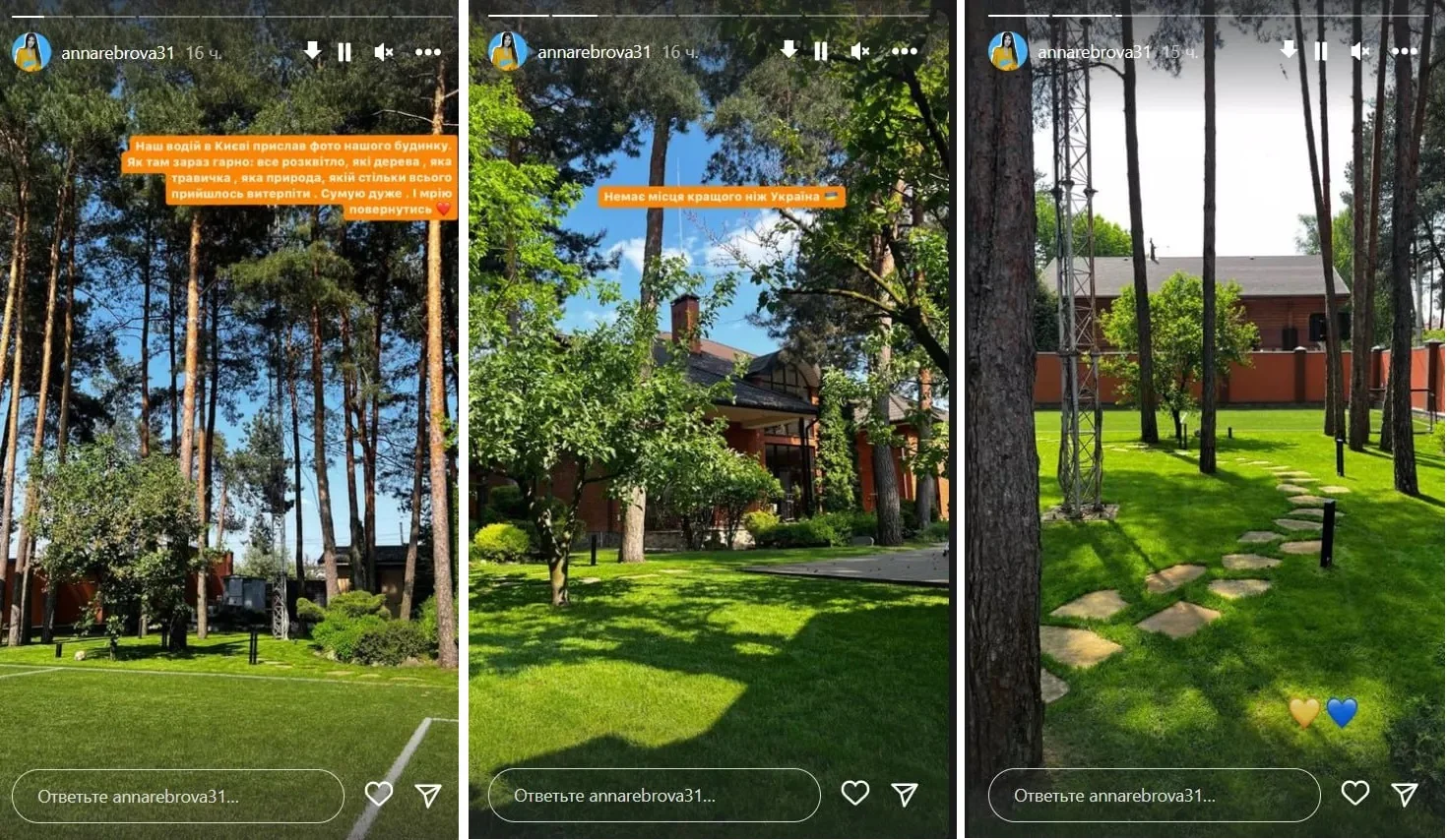 "Наш водитель в Киеве прислал фото нашего дома. Как там сейчас красиво: все расцвело, какие деревья, какая трава, какая природа, которой пришлось вытерпеть столько всего. Скучаю очень. И мечтаю вернуться. Нет места лучше, чем Украина", – написала Анна Реброва.