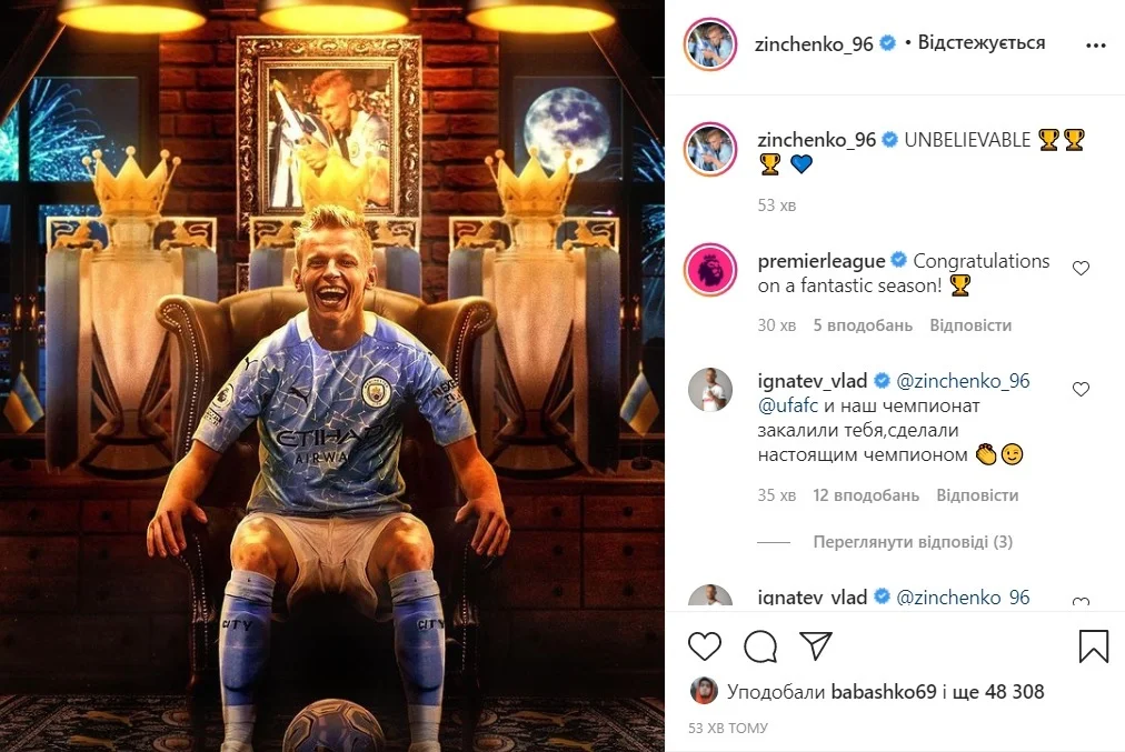 Александр Зинченко был лаконичным, когда реагировал на этот триумф. Украинец в Instagram опубликовал фото, где он сидит на импровизированном троне на фоне трех трофеев. Именно столько чемпионств завоевал Манчестер Сити вместе с нашим соотечественником за последних четыре года. Бонусом к коллажу была подпись: "Невероятно".