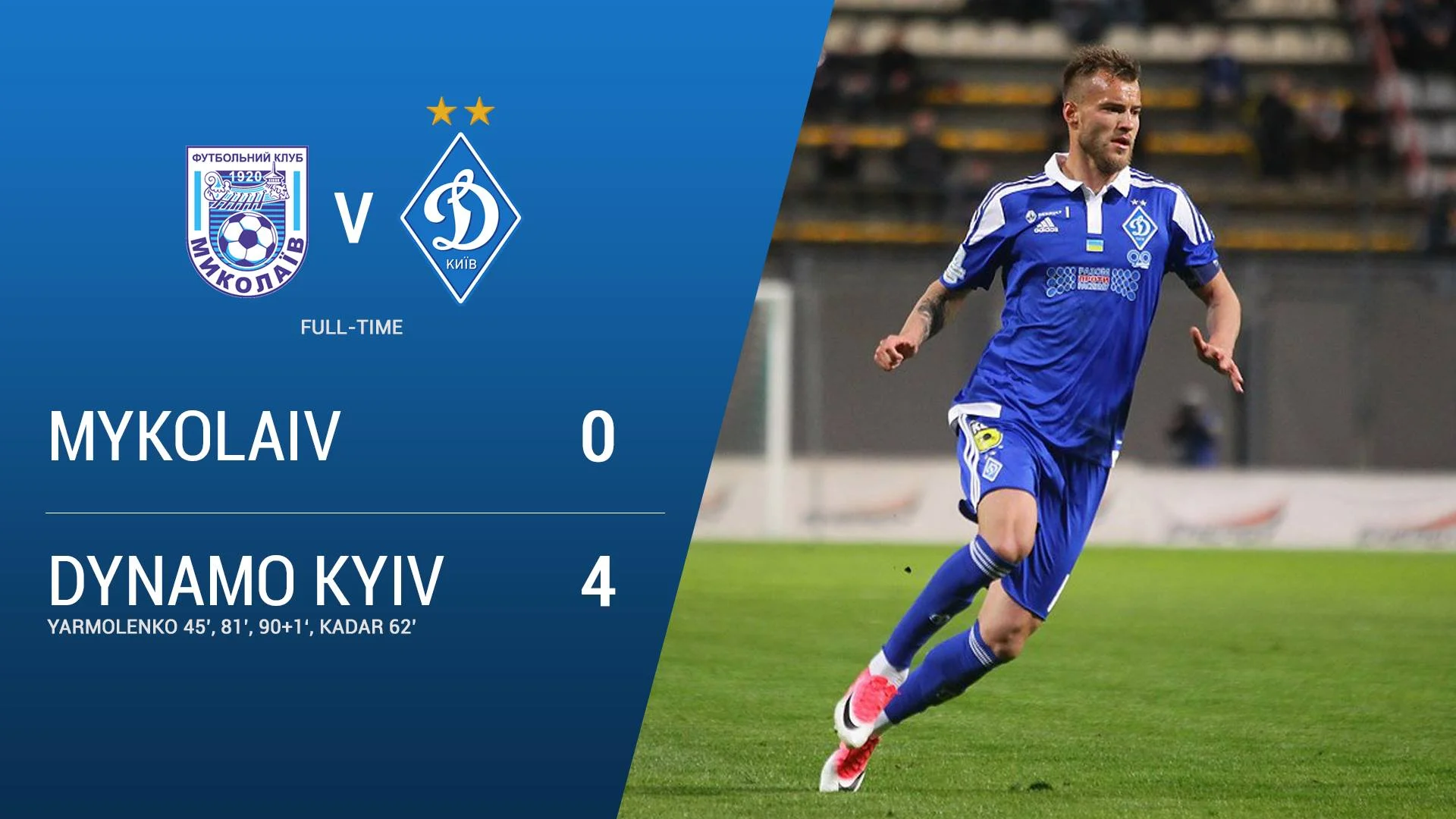 Голы: Ярмоленко, 45+1, 81, пен., 90+1, Кадар, 62