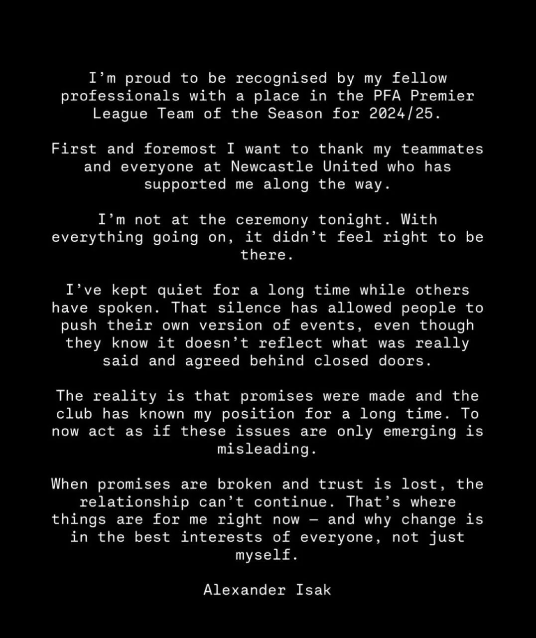 Во вторник, 19 августа, Исак попал в символическую сборную прошлого сезона АПЛ по версии Ассоциации профессиональных футболистов Англии (PFA). Он пропустил церемонию. "Я горжусь тем, что мои коллеги отметили меня местом в символической сборной Премьер-лиги сезона 2024/25 по версии PFA. Прежде всего я хочу поблагодарить своих партнеров по команде и всех в Ньюкасле, кто поддерживал меня на протяжении всего пути.