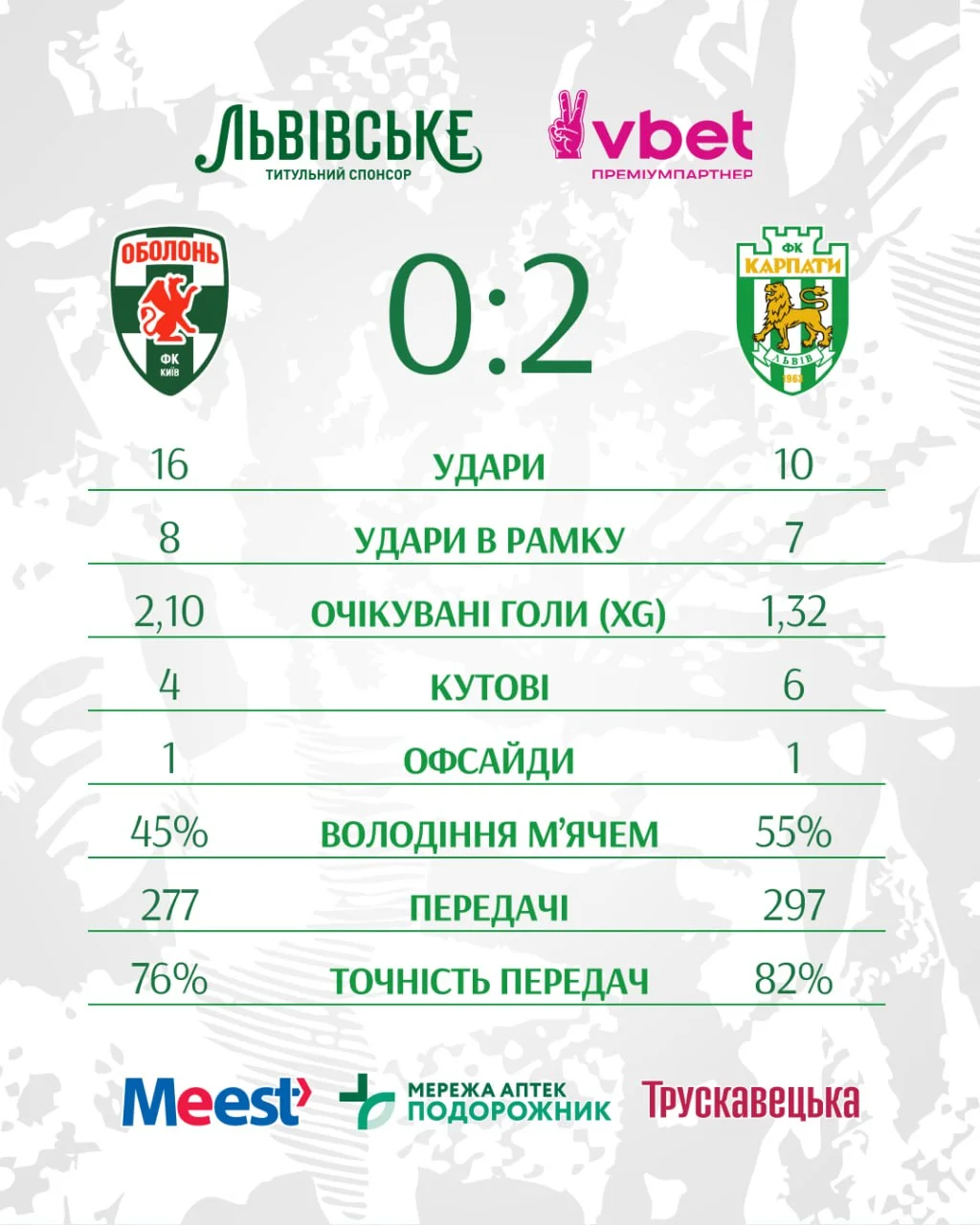 Как сообщает статистический портал Wyscout, Карпаты владели мячом 55% времени, но Оболонь имела преимущество по количеству ударов по воротам: 16 против 10. "Пивовары" нанесли 8 ударов в створ ворот соперника, а у "зелено-белых" их было 7. Интересно, что Оболонь имела более высокий показатель ожидаемых голов – 2,10 xG против 1,32. Несмотря на это, игра завершилась победой Карпат, а киевляне не забили ни одного мяча.