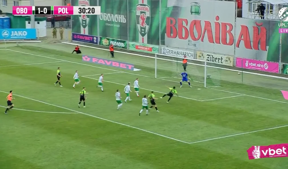 Коучу гостей пришлось снимать с пробега вингера Назаренко, бросив в бой Кравца. Центрбек дебютировал в составе Полесья уже на 5-й минуте – а еще через 5 минут он стал свидетелем шедеврального гола Оболони. Черненко подхватил мяч, сместился с левого фланга и зарядил метров с 25-ти в дальнюю девятку. Без шансов для Бойко. 1:0!