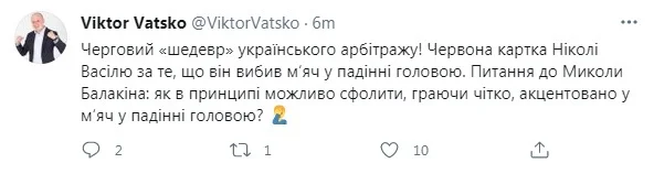 "Очередной "шедевр" украинского арбитража! Красная карточка Николе Василю за то, что он выбил мяч в падении головой. Вопрос к Николаю Балакину: как, в принципе, возможно сфолить, играя четко, акцентировано в мяч в падении головой?" – написал Вацко.