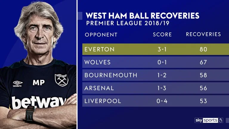 З кожним наступним матчем АПЛ росте кількість підбирань м'яча, які робив Вест Хем. Якщо проти Ліверпуля та Арсенала було 53 і 56, то з Вулверхемптоном і Евертоном – вже 67 і 80 відповідно. Так, так: 80 – більше, ніж будь-який інший клуб за 1 матч поточного англійського сезону. Ще один показовий момент. Лондонці змусили Евертон втрачати володіння частіше, ніж у будь-якому іншому матчі сезону (167 разів).