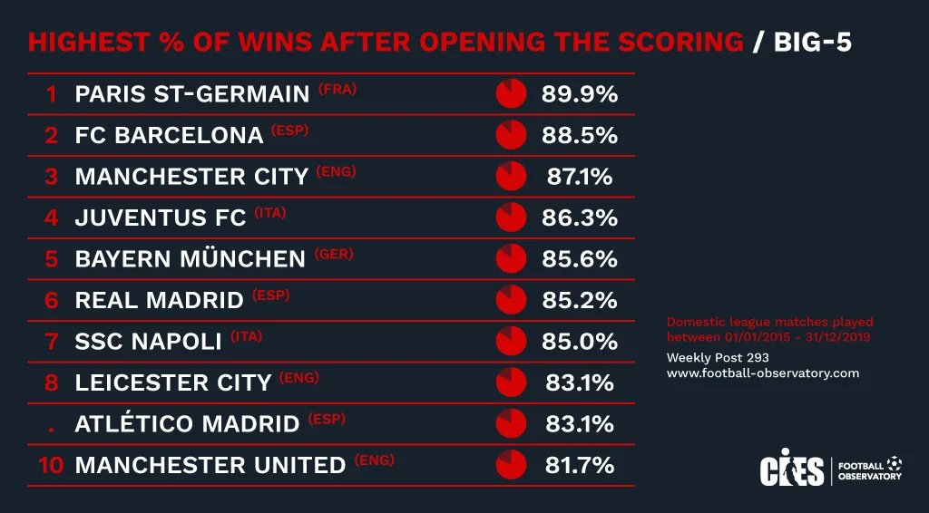 В ведущих чемпионатах никаких сюрпризов. Наилучшие показатели имеют действующие чемпионы 5 элитных лиг. ПСЖ опережает всех – в 89,9% первый гол парижан означает победу. Немного хуже цифры у Барселоны и Манчестер Сити, далее следуют гегемоны Ювентус и Бавария. В топ-10 обращают на себя внимание разве что Лестер с Наполи.