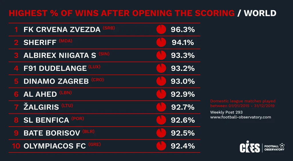 Football Observatory проанализировала, как первые голы влияют на результаты команд 92 топ-дивизионов мира в матчах с 1 января 2015-го по 31 декабря 2019-го. На основе собранных данных были сформированы своеобразные рейтинги.