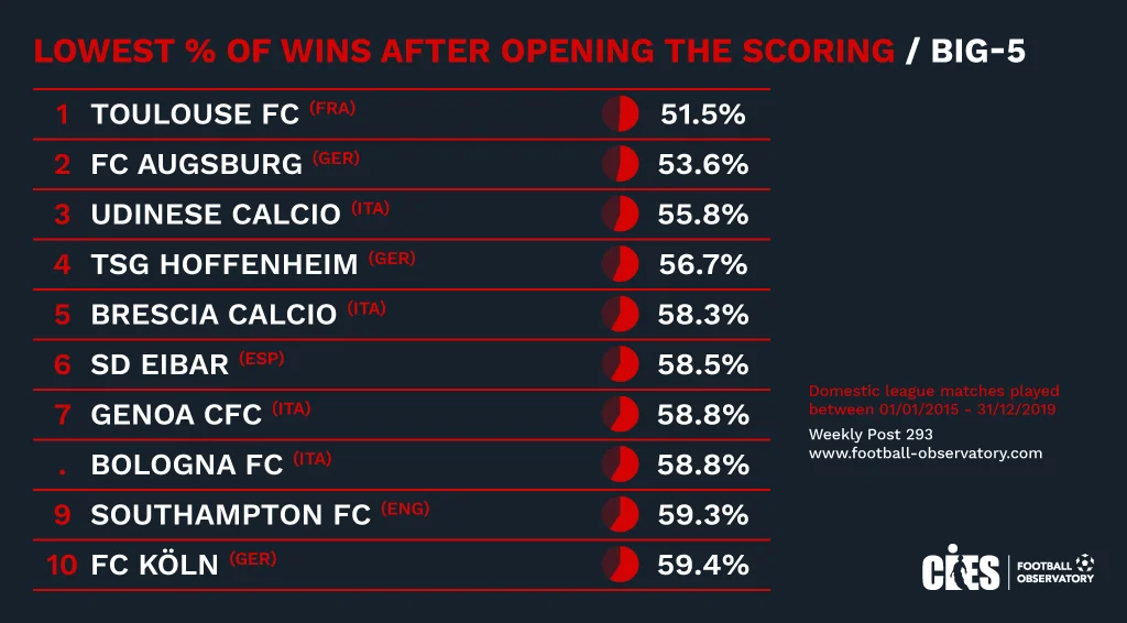 В топ-лигах худшая по этому показателю Тулуза – неудивительно, что "фиолетовые" без шансов вылетают из Лиги 1. Появление крепкого Хоффенхайма так низко тоже нельзя назвать сюрпризом, ведь команда Юлиана Нагельсманна в предыдущие сезоны никогда не начинала играть осторожнее, открывая счет.
