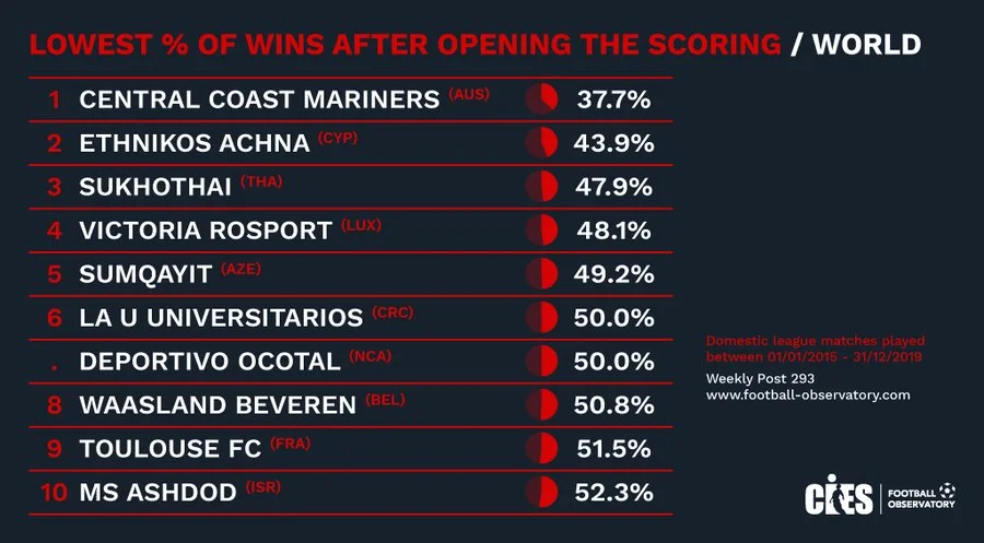 А вот для Сентрал Кост Маринерс первый гол не значит ничего – австралийская команда выигрывает только 37,7% матчей, в которых открывает счет. Второй худший в мире – греческий Этникос, в составе которого выступает Игорь Худобяк. Партнеры легенды Карпат доводят дело до логического завершения только в 43,9% случаев.