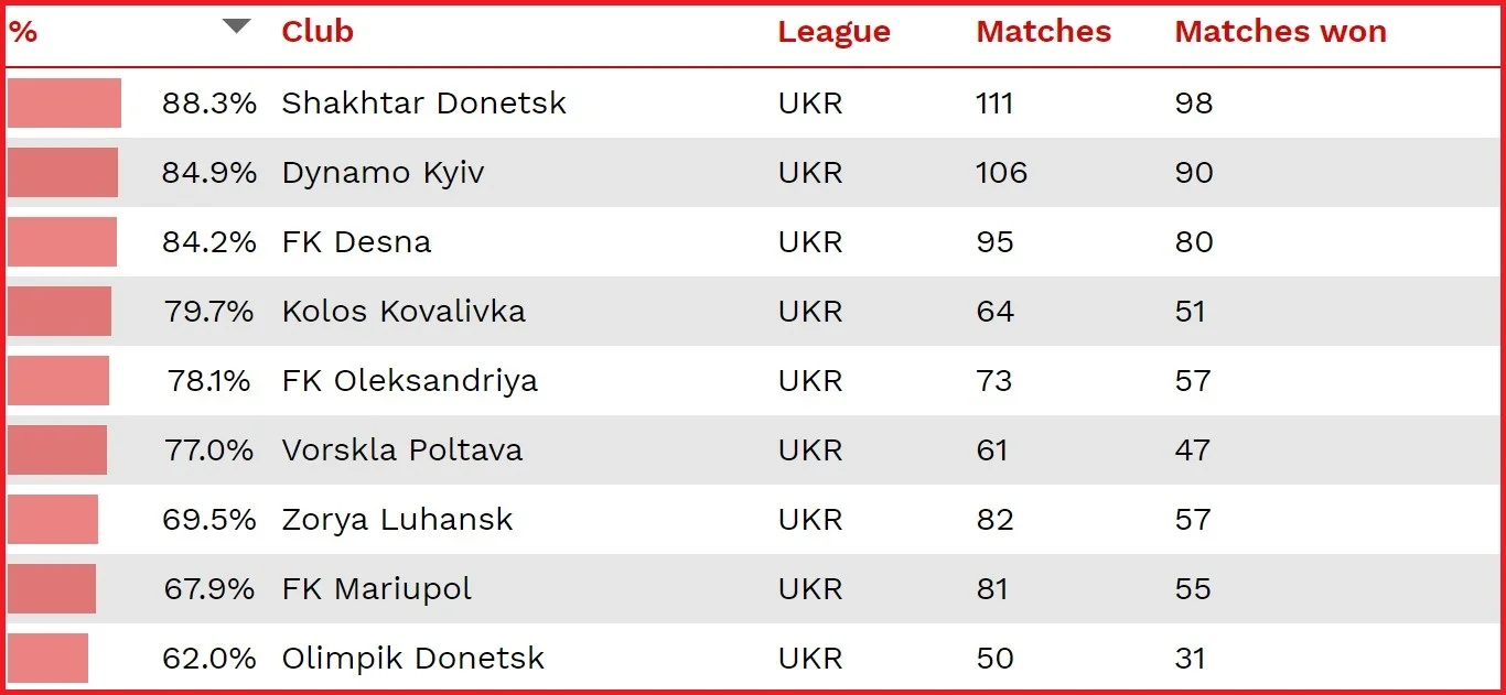 В Украине лучшие также гранды. Шахтер выиграл 98 матчей из 111-ти, в которых открывал счет – 88,3%. Динамо победило в 90 поединках из 106, где забивало первым – 84,9%. Далее следуют Десна и Колос, которые не так давно в элите (этим можно объяснить их высокий процент). В целом в УПЛ в 70,6% случаев побеждает команда, которая открыла счет.
