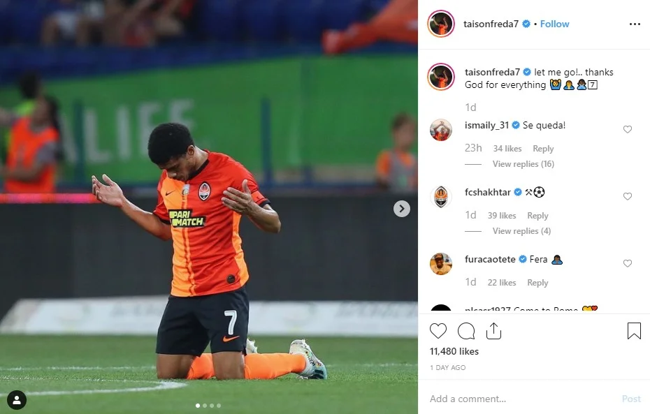 При этом сам Тайсон, похоже, мечтает о Роме. Вчера на фоне слухов бразилец сделал пост в Instagram с просьбой: "Отпустите меня! Спасибо Богу за все". Логично предположить, что это обращение к Шахтеру, чтобы тот снизил цену. Под этим же постом Исмаили выразил желание, чтобы его партнер остался в Украине.