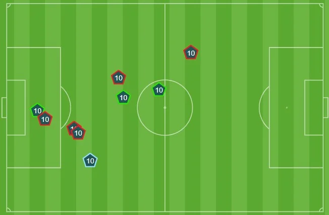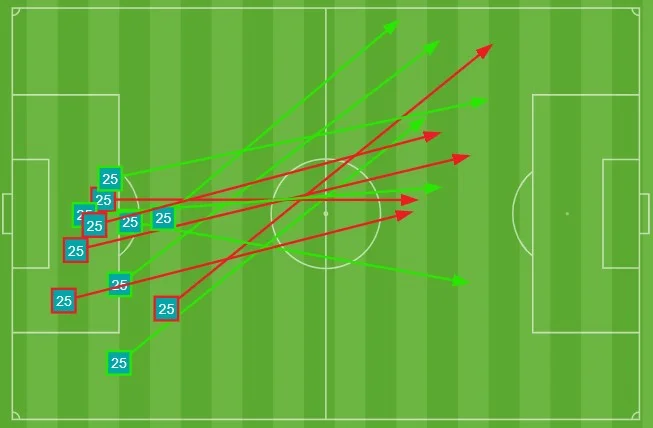 Сегодня Овьедо не разыгрывал мяч от своей штрафной, поэтому Лунин преимущественно выбивал мяч за середину поля. И делал это весьма удачно – 6 из 11 лонгболлов оказались точными. Очень приличный показатель.
