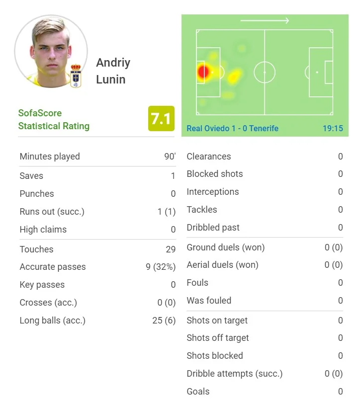 Лунин получил третью оценку в команде от статистического портала SofaScore – 7.1.