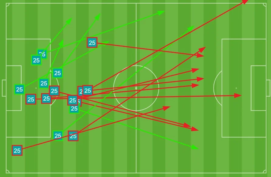 Стоит отметить низкую точность передач Лунина – 32%. Розыгрыш через короткий пас на левый фланг проходил, а вот лонгболы на чужую половину редко находили адресатов – всего 3 выноса из 13 оказались точными.