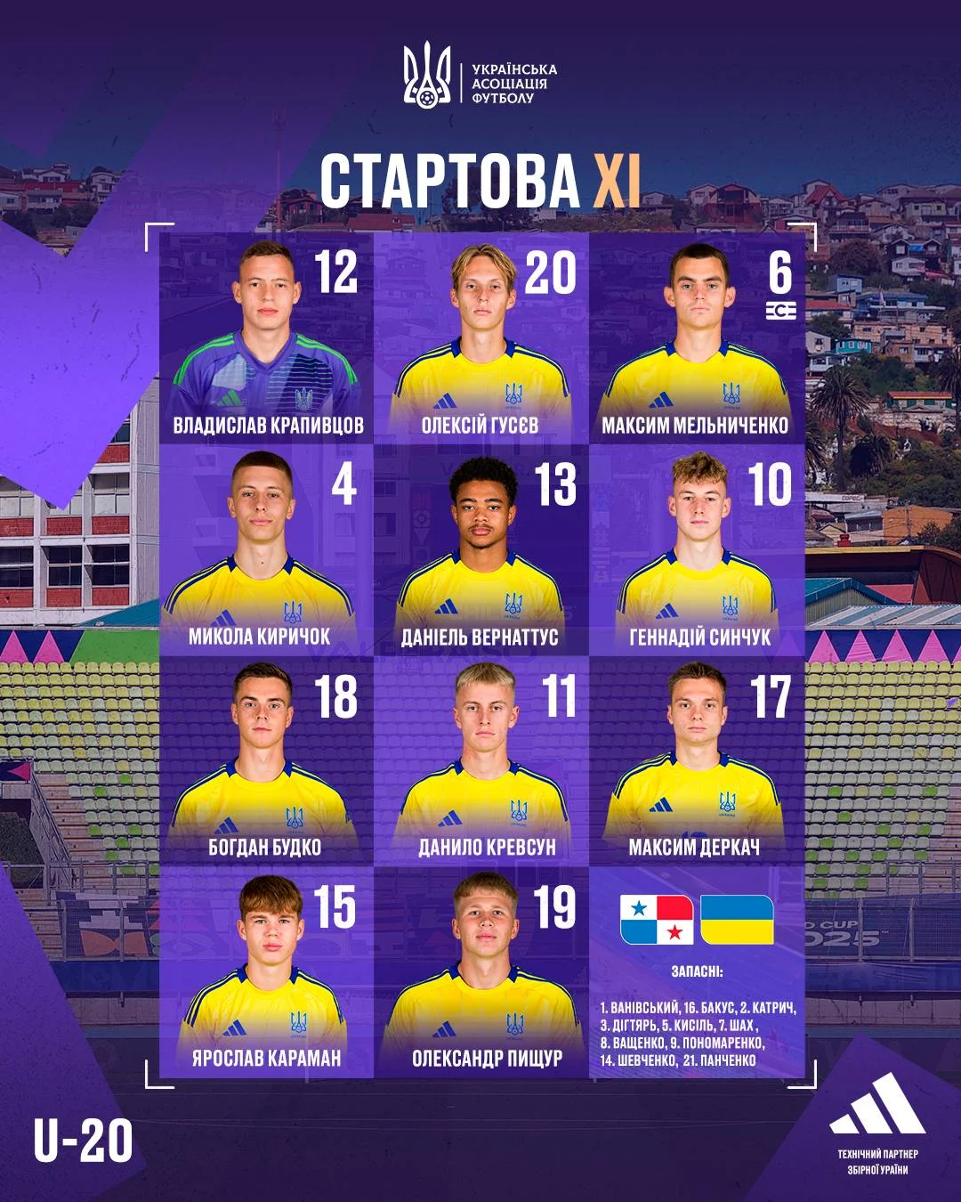 Стартовый состав Украины U-20: Крапивцов, Гусев, Мельниченко, Киричок, Вернаттус, Синчук, Будко, Кревсун, Деркач, Караман, Пищур.