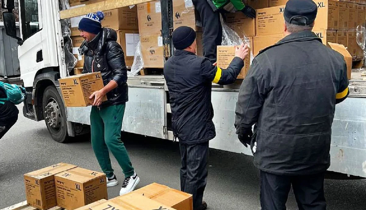 Артём Милевский (слева) помогает разгружать гуммопомощь для киевлян / Фото из соцсетей