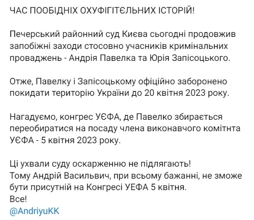 Обоим запрещено покидать пределы Украины до 20 апреля 2023 года. Интересно, что 5 апреля должен состояться конгресс УЕФА, где Павелко планировал переизбраться на должность члена исполнительного комитета УЕФА. Решение суда не подлежит обжалованию, поэтому президент УАФ не сможет присутствовать на конгрессе.