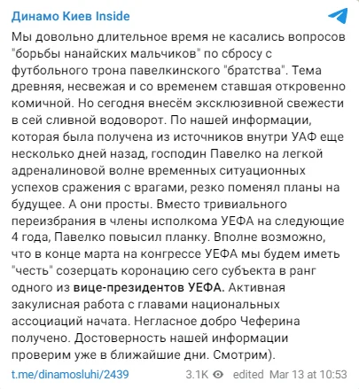 "По нашей информации, которая была получена из источников внутри УАФ еще несколько дней назад, господин Павелко на легкой адреналиновой волне временных ситуационных успехов сражения с врагами резко поменял планы.