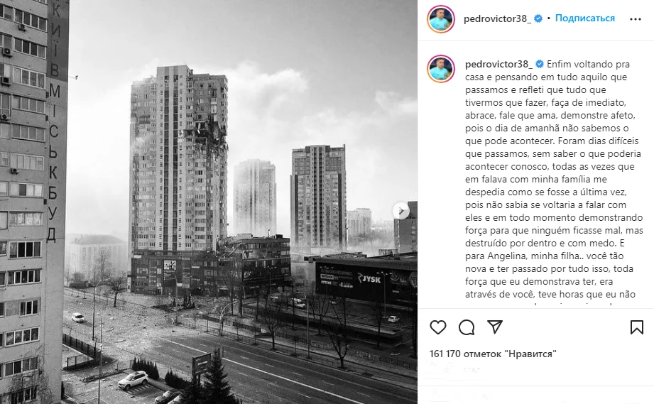 Я прошу вас поскорее покончить с этим. Мы должны продолжать молиться о тех, кто все еще борется за то, чтобы выбраться оттуда. Спасибо всем, кто молился за нас, потому что, когда я думал, что уже не выберусь, бог сделал невозможное возможным. Остановите войну", – написал Педриньо на своей странице в социальной сети Instagram.