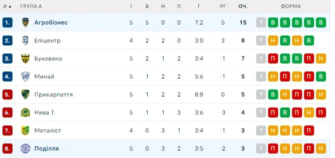 Агробизнес продолжил идеальный старт нового сезона, минимально победив Подолье благодаря точному удару Войтыховского. Это позволило подопечным Александра Чижевского одержать 5-ю победу в 5 сыгранных матчах, оторвавшись от второго места уже на 7 очков. А Минай расписал безголевую ничью с Эпицентром, который и занимает второе место.