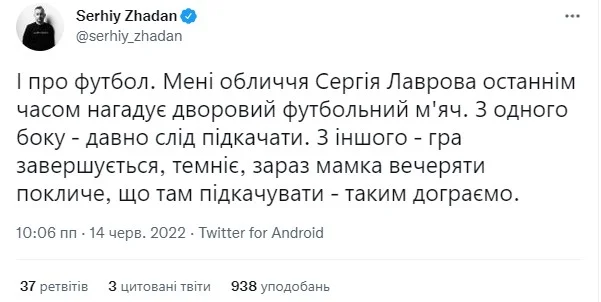 Мабуть, вперше за період повномасштабної війни озвався на футбольну тему світоч нашої літератури Сергій Жадан. Вистрелив одразу двома твітами: один – щодо чудернацького календаря збірної, а інший присвячений... їб*лу провідного покидька планети.