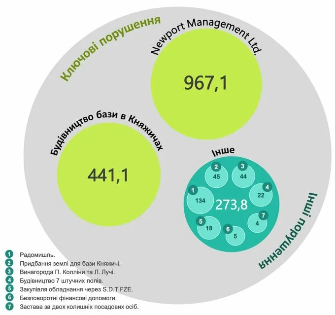 В список других нарушений попали: строительство семи искусственных полей, вознаграждения для Пьерлуиджи Коллини и Лучано Лучи, безвозвратная финансовая помощь, приобретение земли. Отмечается, что еще более 500 миллионов гривен потеряно из-за расчетов УАФ с легендарной оффшорной компанией-агентом Newport Management Ltd.