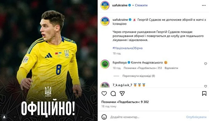 Полесье отреагировало на травму Судакова – клуб предложил сборной Украины своего игрока