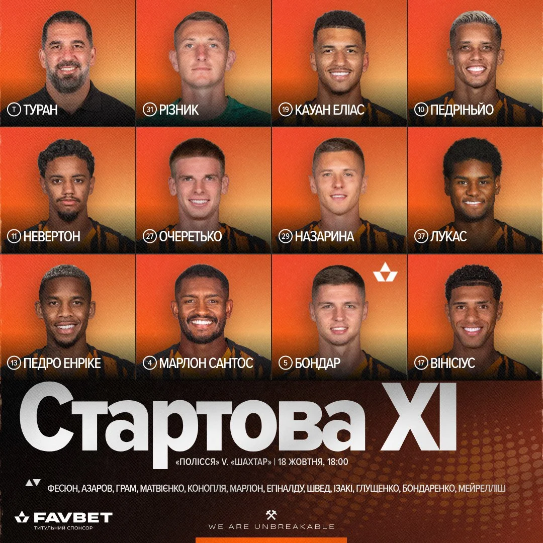 Шахтер: Резник, Педро Энрике, Марлон Сантос, Бондарь, Тобиас, Очеретько, Назарина, Педринью, Невертон, Лукас Феррейра, Кауан Элиас