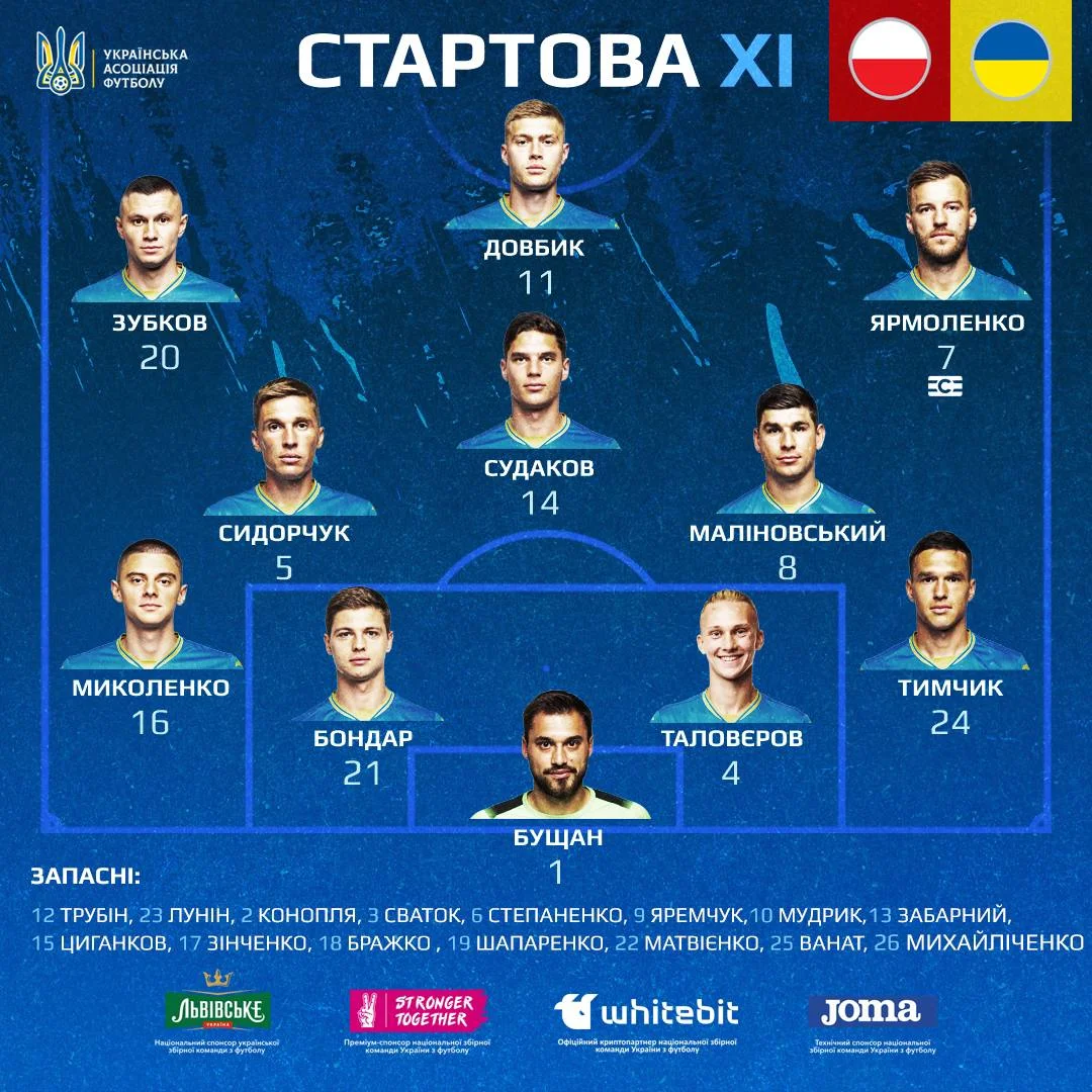Икраина: Бущан – Тимчик, Таловеров, Бондарь, Миколенко – Сидорчук, Малиновский – Ярмоленко, Судаков, Зубков – Довбик.