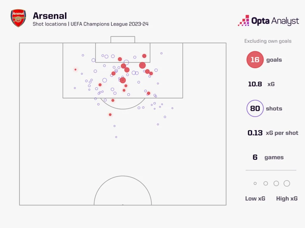 Вообще, Арсенал на групповом этапе нанес аж 80 ударов и забил 16 мячей, причем средний показатель ожидаемых голов составил 0,13. Это – очень много. 0,2 xG уже считается явным голевым моментом.