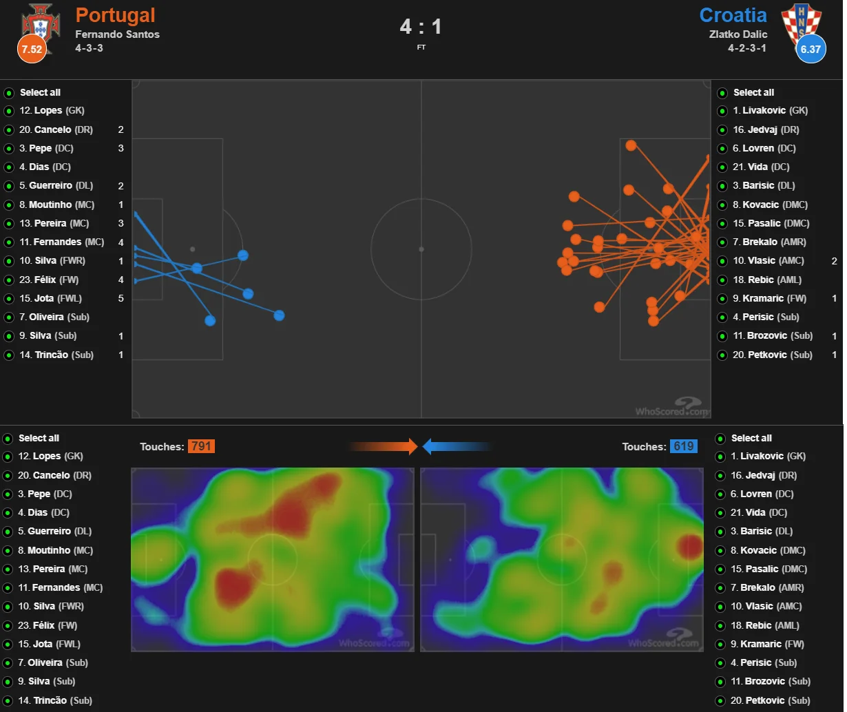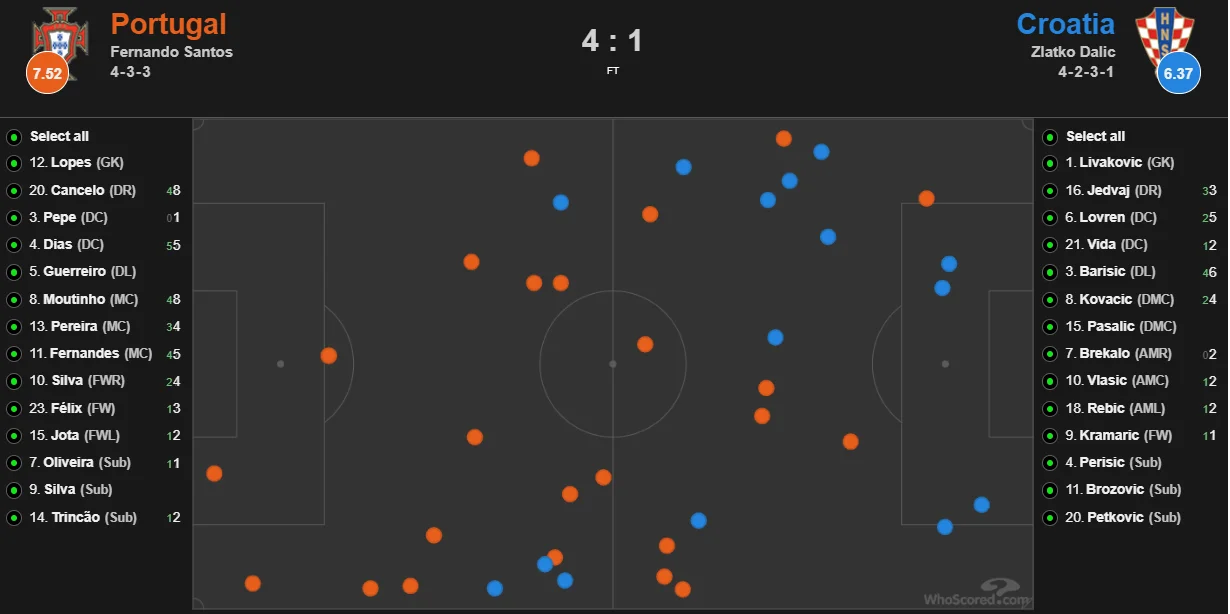 Пиренейцы владели мячом 57% игрового времени – это довольно много, учитывая контратакующее содержание их игры. По ударам Португалия выиграла со счетом 27:5 (11:2 в створ + 3 штанги), по пасам под них – 22: 5, а общая точность передач достигла 89% (у хорватов – 83%). При этом европейские бразильцы не очень-то ставили на дриблинг – из 24 попыток обводки успешными стали 12, в то время как у хорватов было 17 успешных попыток из 21.
