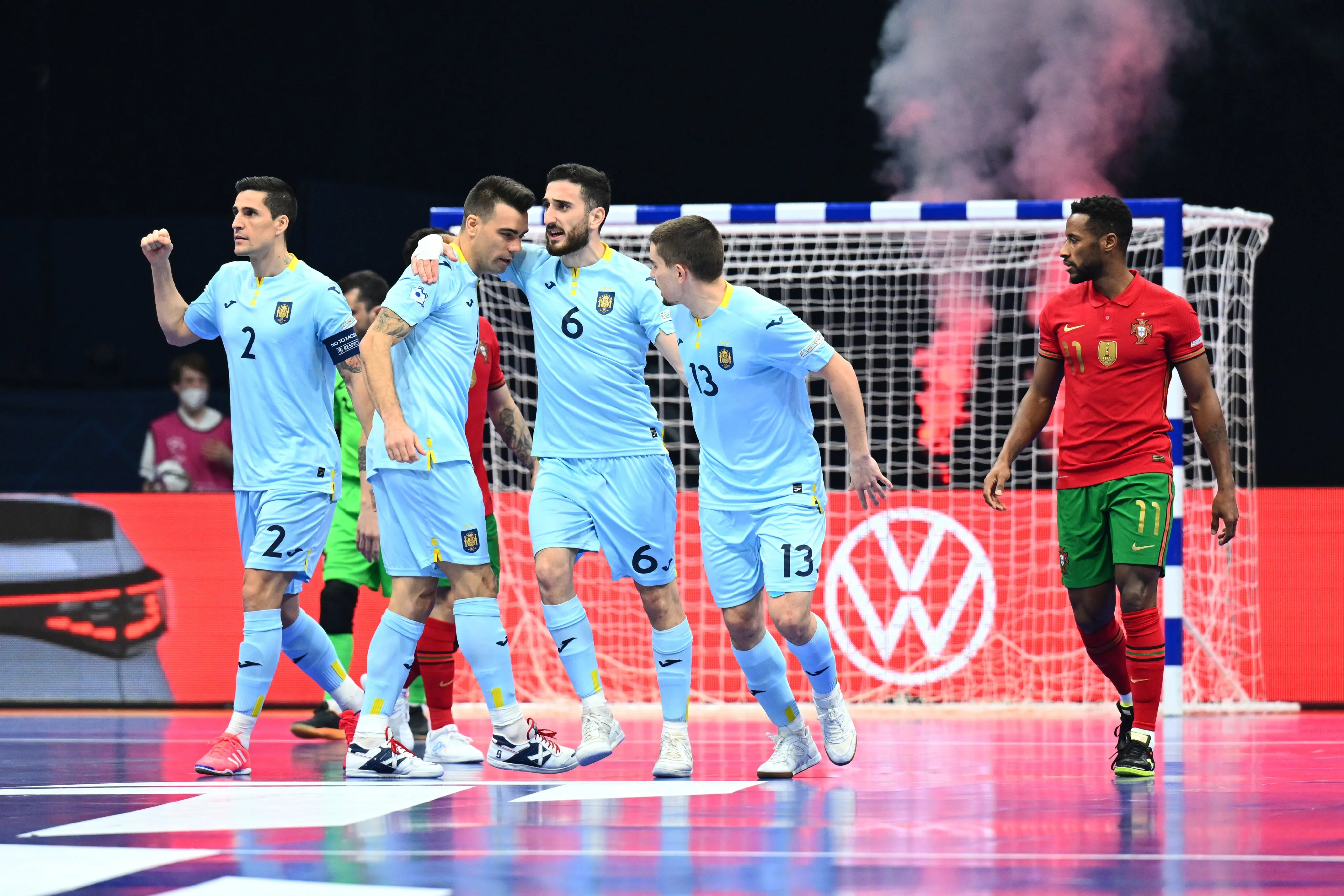 Действующий чемпион мира и чемпион Европы 2018 пропустил от испанцев уже на первой минуте. Подопечным Жорже Браза никак не удавалось переломить ход поединка и, наконец, они пропустили во второй раз. За 8 минут до завершения первого тайма Испания заработала право на штрафной. Соперник ожидал прямого удара, однако игроки разыграли стандарт, переведя мяч на другой фланг, и Чино мощным ударом увеличил преимущество.
