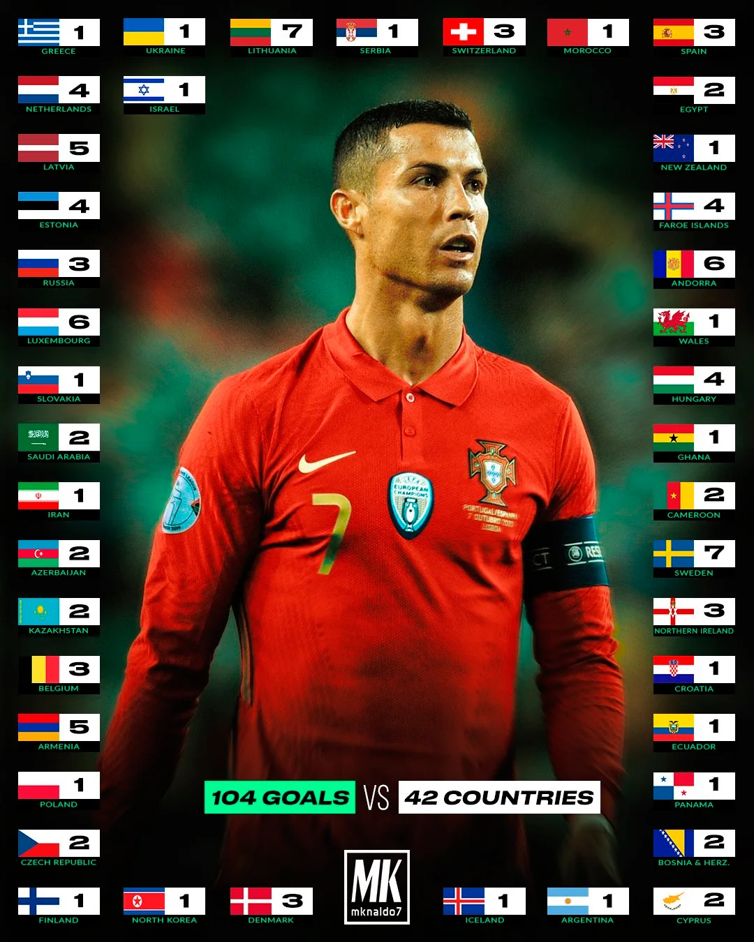 Криштиану является довольно противоречивой персоной в тактическом плане, но гениальные бомбардирские навыки португальской "семёрки" не вызывают сомнений и в 36 лет. За 70 минут встречи против Израиля капитан "селесао" сделал 16 касаний в штрафной (лидер матча) и провёл 7 ударов (3 в створ). Своим выстрелом перед перерывом он забил свой 104-й гол в составе Португалии – причём Израиль стал аж 42-й страной-жертвой Роналду. До завоевания статуса лучшего бомбардира сборных КР7 не хватает всего 6 мячей.