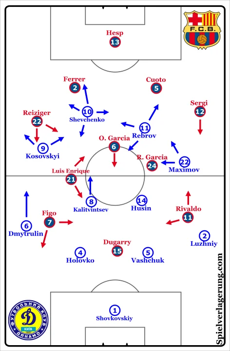 4-2-2-2 Динамо засяяли під час позиційних атак на половині Барселони. Центрфорварди Шевченко та Ребров мали багато свободи в атаці. У деяких ситуаціях вони вдвох відтягувалися назад, втікаючи від захисту Барселони, та опинялися між лініями. Подвійною фальшивою "дев'яткою" їх не назвеш, але цей дует відмінно користувався тим, що Коуту та Феррер не могли слідувати в опорну зону, і вигравав для себе простір для роботи з м'ячем.