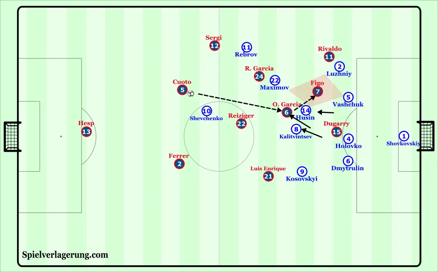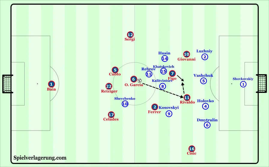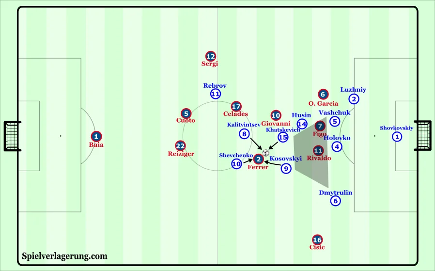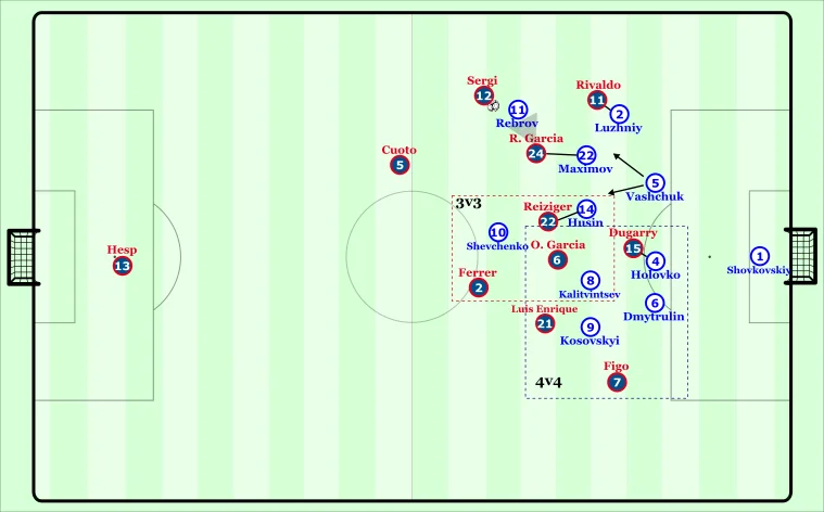 Шевченко грав ближче до протилежного краю, тому Серхі мав достатньо простору, аби просувати м'яч вперед. Однак дуже рідко користувався ним: не йшов у дриблінг, не здійснював ривків. Натомість намагався довгими передачами знайти Дюгаррі. Француз виступав у ролі таргетмена під подачі Рівалдо та Фігу.