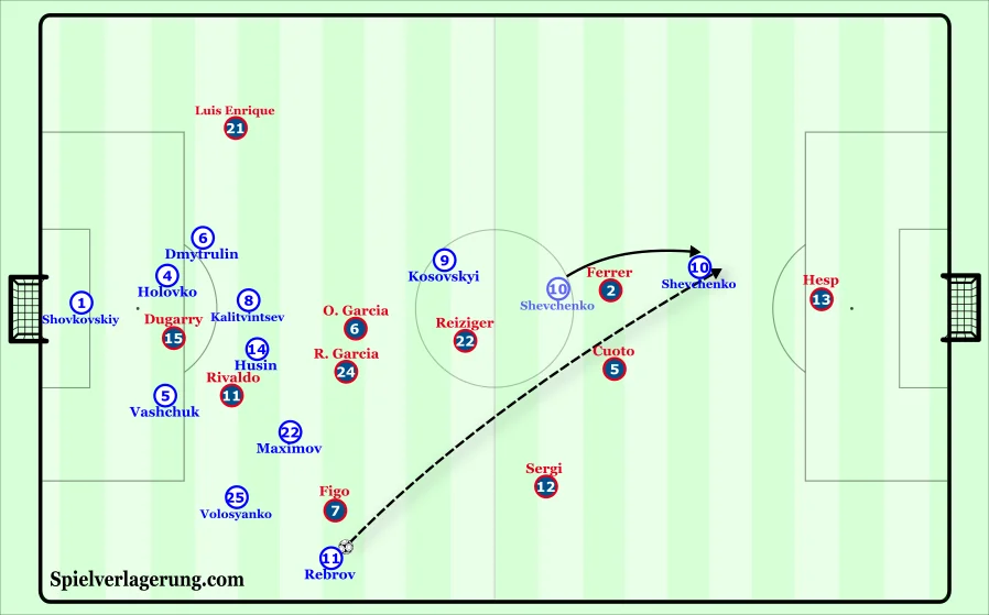 Один з прикладів на рисунку. Розвалений півзахист Барселони дав Реброву достатньо часу, щоб вирізати класний пас Шевченку. Андрій залишився проти двох захисників, стартував трішки глибше і на швидкості вистрибнув з-за спин. Хесп мусив вийти з воріт, щоб врятувати епізод, а натомість завалив Шеву на газон і побачив перед собою червону картку. Вилучення голкіпера гостей фактично вирішило долю поєдинку.