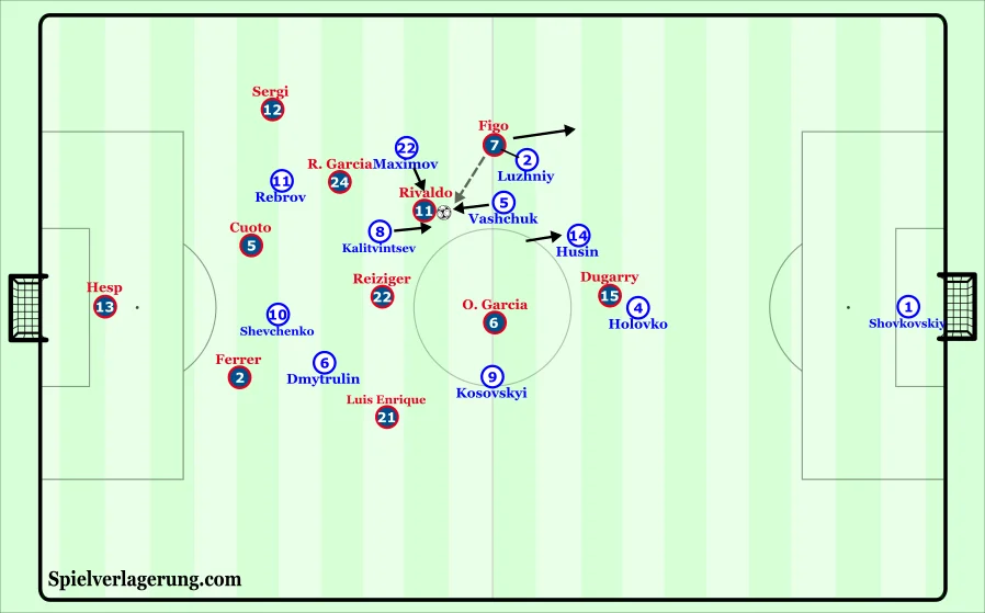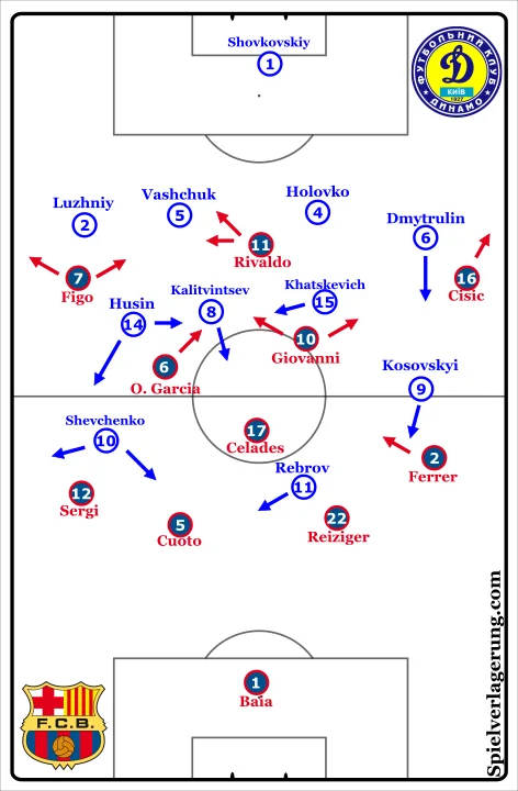 Бразильський дует Рівалдо-Джованні на старті поєдинку постійно мінявся місцями, щоб уникнути персональної оборони Динамо та витягнути українських захисників зі звичних зон. Ці переміщення не призводили до моментів, але обидва бразильці часто отримували м'яч, внаслідок чого Барселона збільшувала тиск. Вони розташовувалися між лініями, тому змішаній системі оборони Динамо було складно повністю їх перекрити.