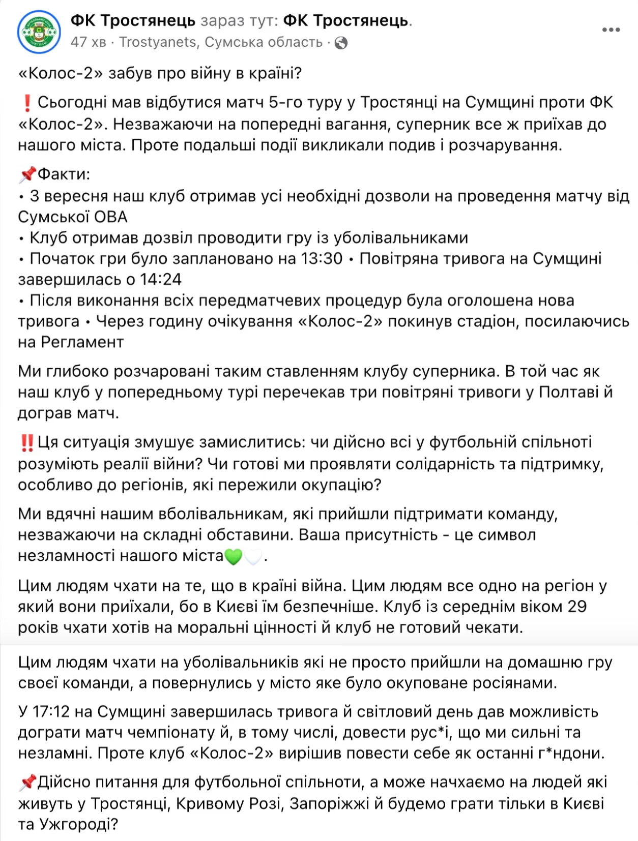 Этим людям чихать на болельщиков, которые не просто пришли на домашнюю игру своей команды, а вернулись в город, который был оккупирован россиянами. В 17:12 на Сумщине завершилась тревога, и световой день дал возможность доиграть матч чемпионата и, в том числе, доказать русским, что мы сильны и несокрушимы. Однако Колос-2 повели себя как последние га***ны", – написала пресс-служба Тростянца на странице в Facebook.