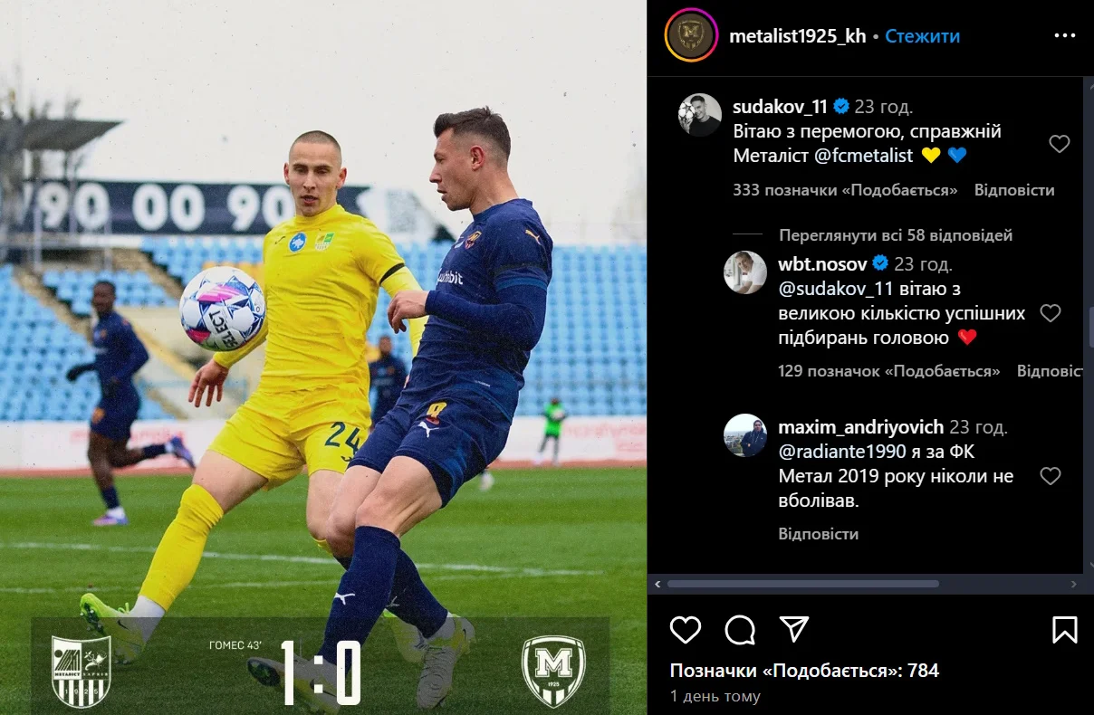 6 апреля состоялся матч Первой лиги Украины между Металлистом и Металлистом 1925. Победу в дерби одержал Металлист, но страсти не утихли даже после игры. В частности звезда Шахтера Георгий Судаков оставил колючий комментарий под постом пресс-службы Металлиста 1925 в Instagram.