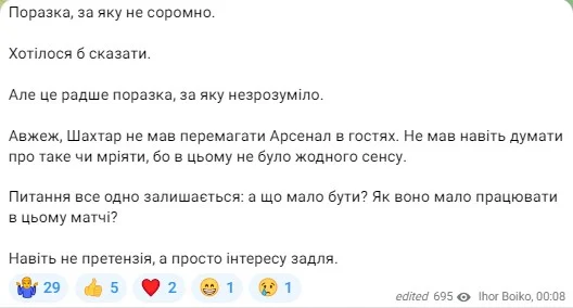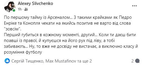 Коментатор Setanta Sports і автор телеграм-каналу "Противний голос" Ігор Бойко підібрав влучну фразу, яка характеризує матч у Лондоні: "Поразка, за яку незрозуміло".
