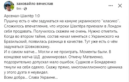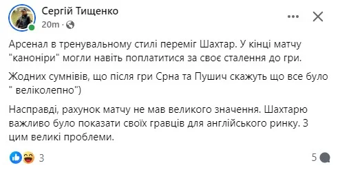 Деякі експерти переконані: честь чемпіонів України не постраждала лише тому, що Арсенал не дуже-то й хотів напружуватись. Попереду в команди Артети надважлива битва у чемпіонаті з Ліверпулем. Ще дехто натякає, мовляв, основна мета Шахтаря в цьому матчі полягала у рекламі своїх головних талантів. Є питання і до Пушіча.