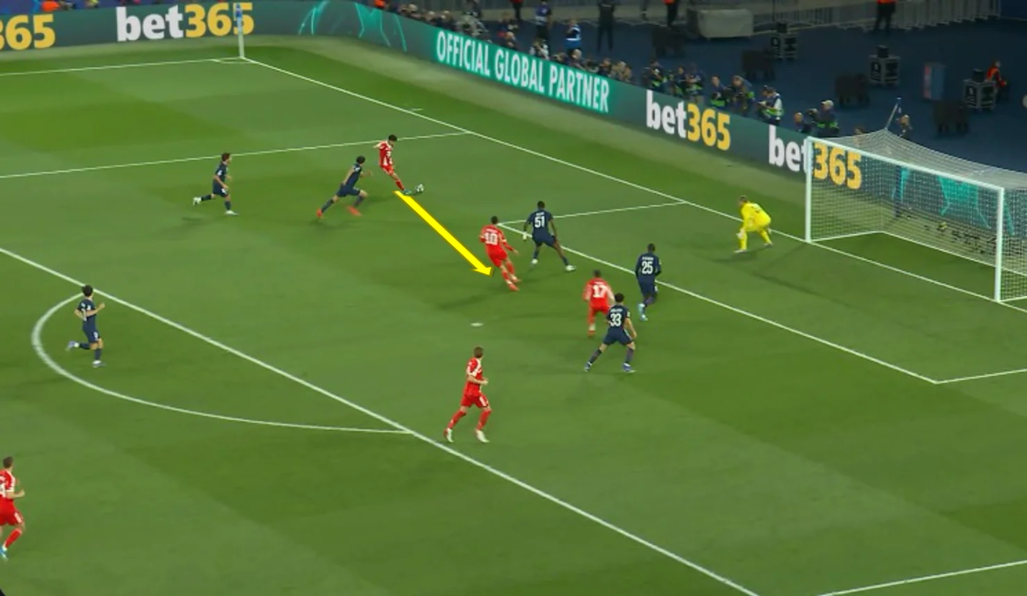 После этого Бавария начала пропускать контратаку за контратакой. Одна из них должна была завершаться выходом один на один, но Усман не смог пройти Упамекано несмотря на несколько попыток обыгрыша. Стоит отметить скидку пяткой от Дуэ и разрезной пас Витиньи.