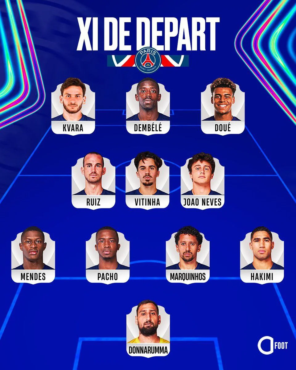 ПСЖ: Доннарумма – Хакими, Маркиньос, Пачо, Нуну Мендеш – Невеш, Витинья, Фабиан Руис – Дуэ, Дембеле, Кварацхелия