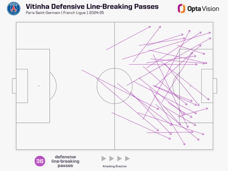 Когда ПСЖ играет основным составом, сыгранность и класс исполнителей позволяют творить чудеса. С точки зрения построения позиционной атаки этот коллектив не знает равных в мире. Достаточно посмотреть на карту разрезных пасов Витиньи в Лиге 1.