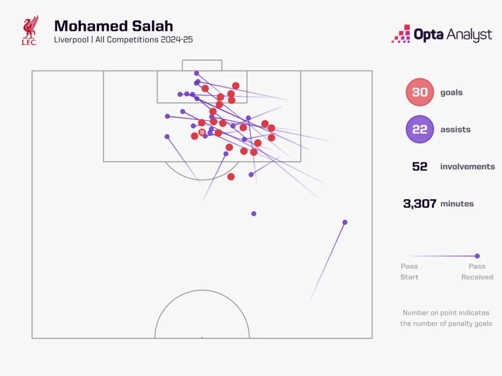 Впрочем, Ливерпулю есть кем ответить. Салах еще до конца февраля забил 30 голов и отдал 22 ассиста. Из 52 результативных действий 15 было проведено после Нового года. По количеству голевых передач в сезоне 2024/25 египтянин лидирует с бешеным отрывом, если принять во внимание игроков из топ-5 лиг.