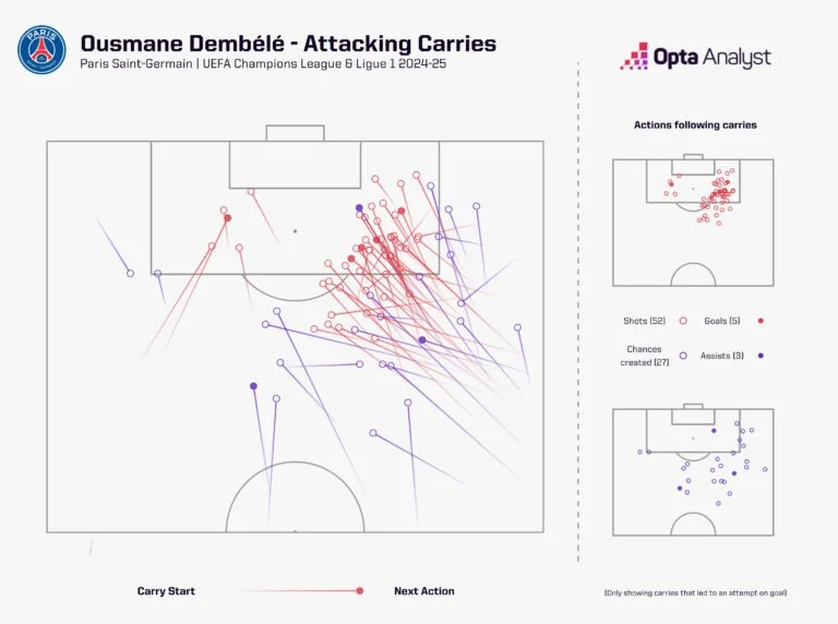 Главным бриллиантом Лучо Энрике остается Дембеле, которого перевели в центр нападения – это решение оказалось гениальным. Усман в 2025 году является лучшим бомбардиром топ-5 лиг Европы, забив 18 голов. Кроме того, француз в рамках ЛЧ провел 87 продвижений ведением на чужой половине поля.