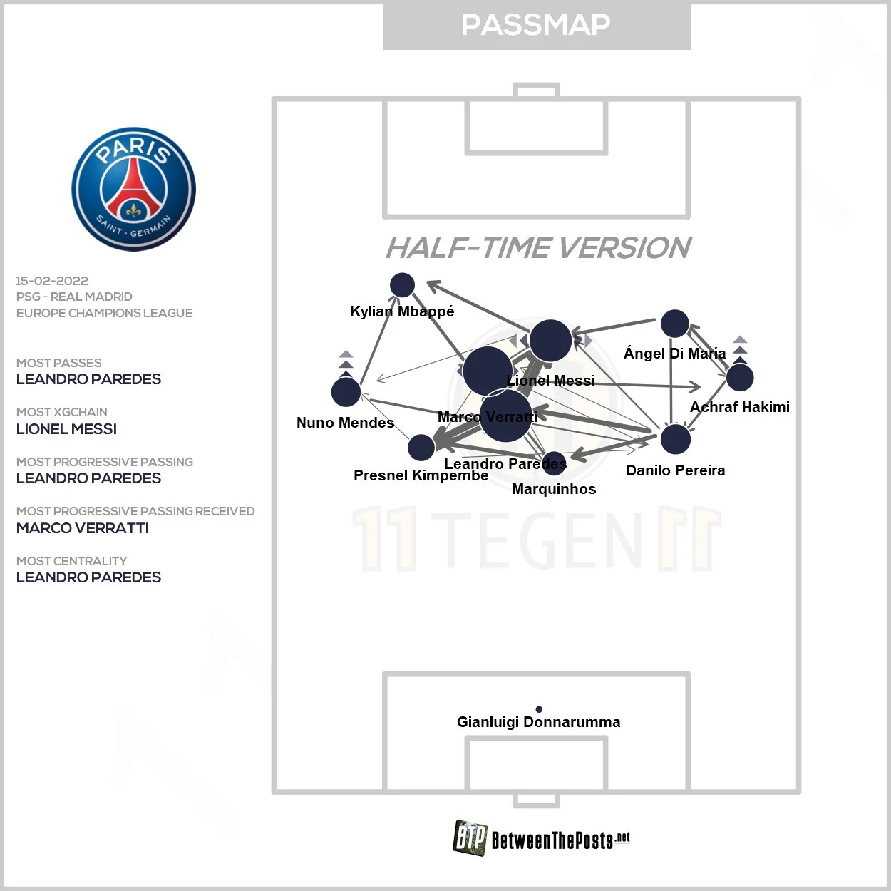 Парижане пытались оставаться в более высоких позициях, втискивая Реал поближе к его штрафной. Фулбеки действовали на одной линии с нападающими, а Паредес и Веррати контролировали пространство за центральным кругом – центрхавы моментально накрывали оппонентов при попадании мяча в эту зону, после чего быстро отдавали его вперед. Данилу же действовал ниже, помогая центрбекам. Благодаря высокой скорости и интенсивности работы хозяевам удалось загнать Реал в его треть поля, вообще не выпуская его на чужую половину.